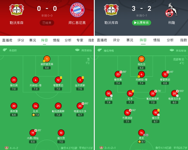 在双方首回合的较量中,拜仁慕尼黑借主场之利完成了一次高质量的演出,一扫图赫尔时代面对勒沃库森时攻守失据之颓势。尽管拜仁慕尼黑在接下来的强强对话中表现一般,但这场比赛还是给哈维-阿隆索留下了深刻印象,间接促成了此役的变阵。放弃了三中卫阵型,让六名后卫同时出场,哈维-阿隆索不仅在排布首发时非常保守,临场指挥方面也是慎之又慎。勒沃库森在控球率(56%-44%)和射门次数(15-2)上取得了压倒性优势,却始终未能将优势转化为进球,维尔茨和内森-特拉领衔的“无锋阵”运转了85分钟,阿德利和希克直到最后时刻才登场,博尼费斯更是全程在替补席上观战。一周前德国杯淘汰科隆时,哈维-阿隆索表示会在接下来尝试让希克和博尼费斯同时首发,结果此役两名球员都坐上了替补席上。